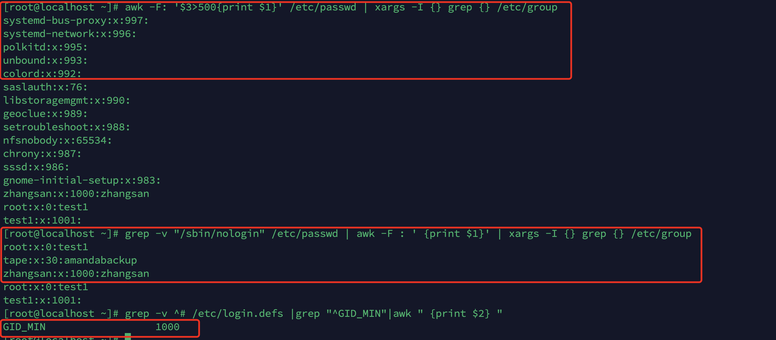 高权限组grep -v ^# /etc/login.defs |grep "^GID_MIN"|awk “ {print $2} ”awk -F: '$3>500{print $1}' /etc/passwd | xargs -I {} grep {} /etc/groupgrep -v "/sbin/nologin" /etc/passwd | awk -F : ' {print $1}' | xargs -I {} grep {} /etc/group