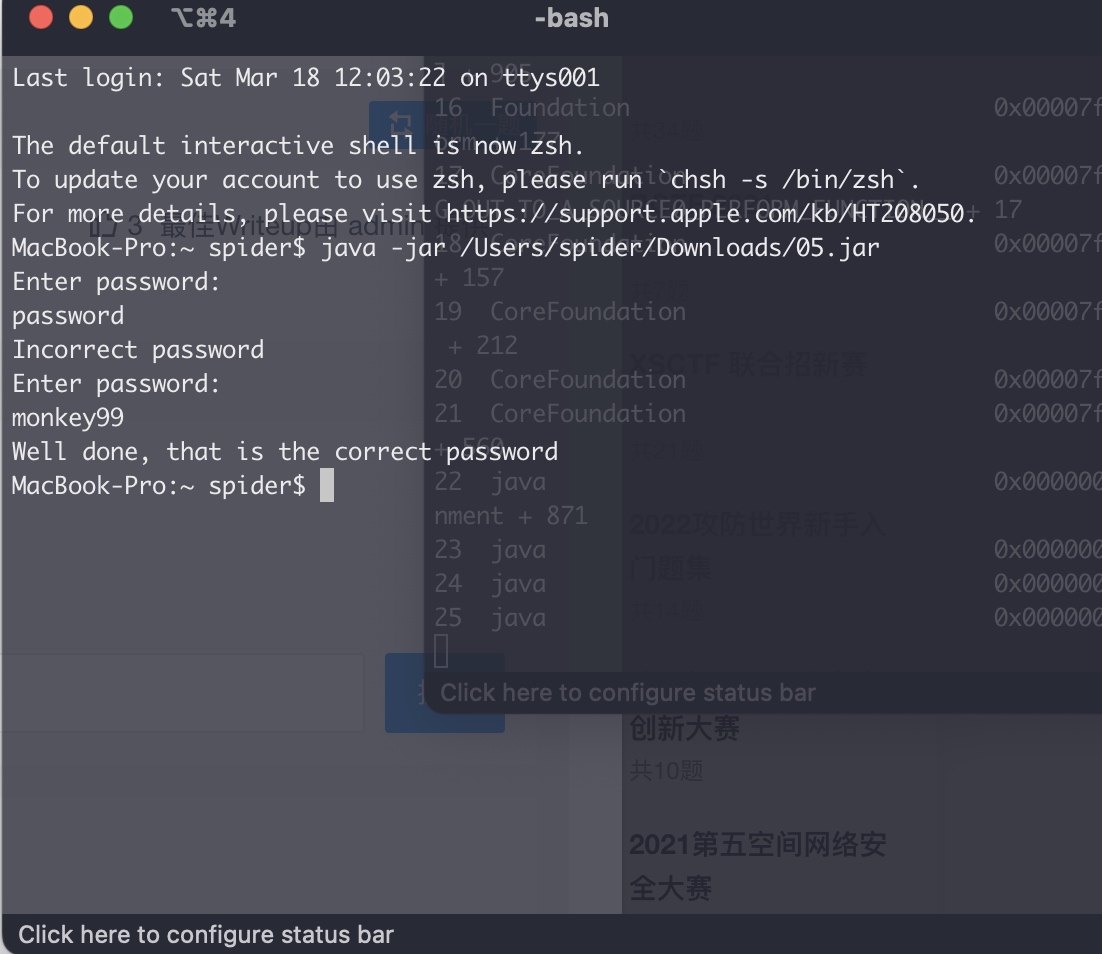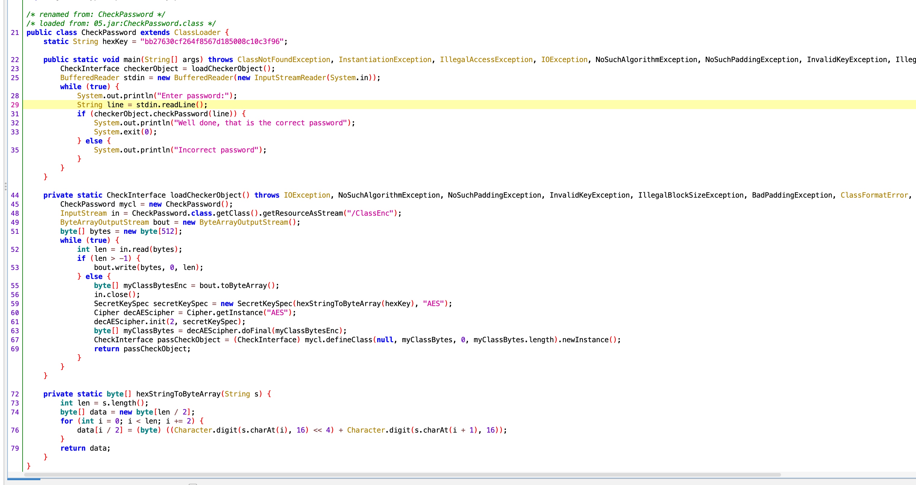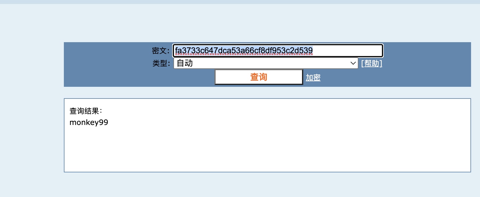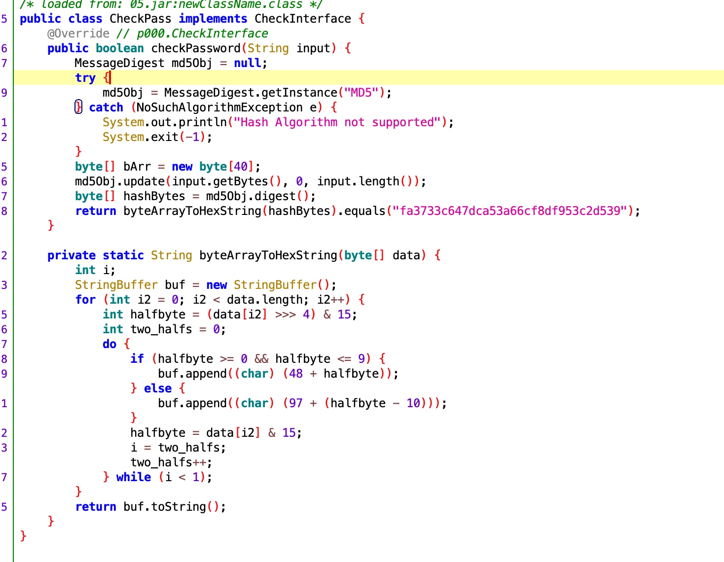 这题是Jar包的形式,不要使用Jar2Dex工具,会丢失部分数据,找到入口函数,中间有一个读入对比判断,跟入判断,这个判断函数将输入的数据做MD5计算,将这个MD5字符串拿去解密,最后验证一下检查当前密码确定MD5信息,字节数组转换为16进制