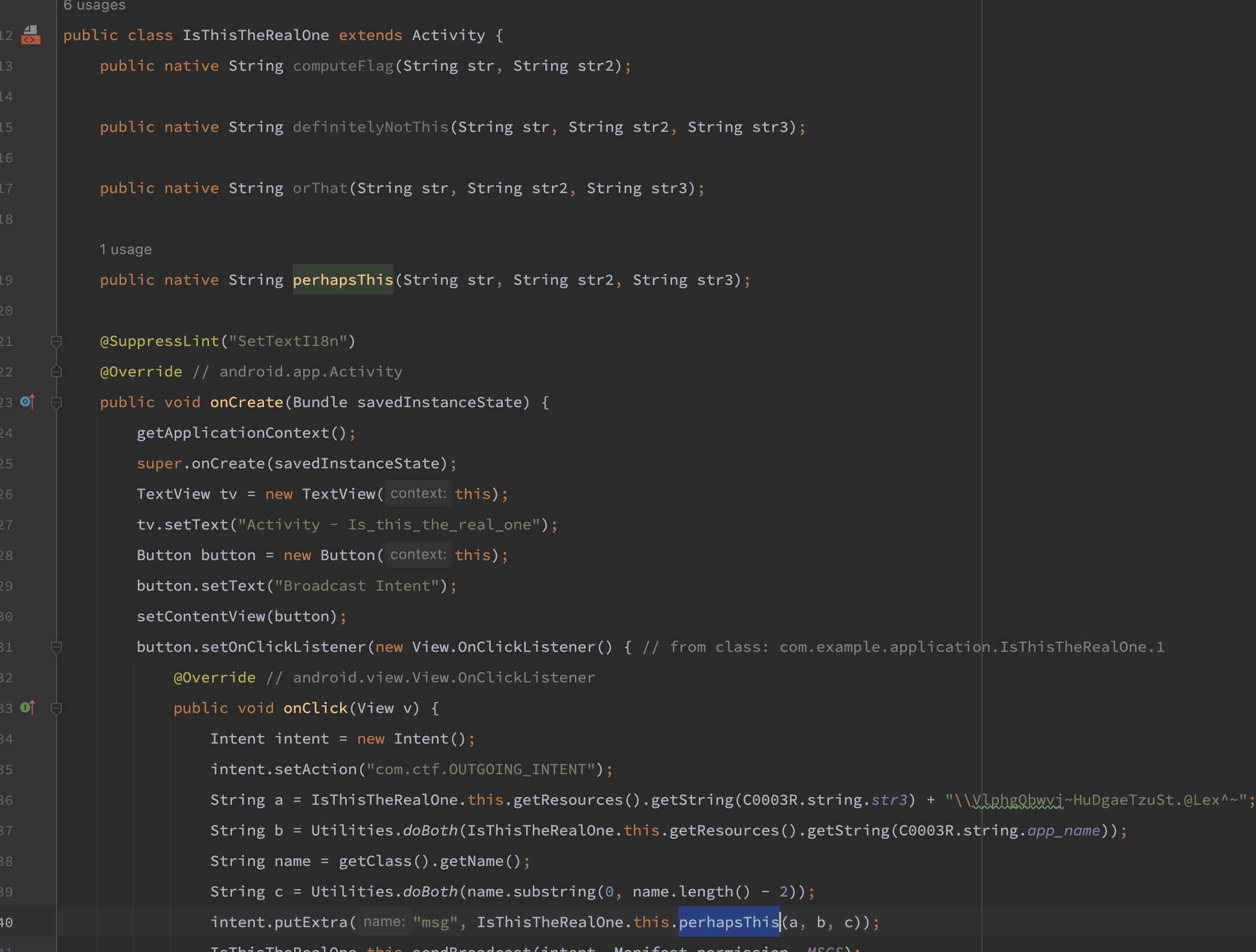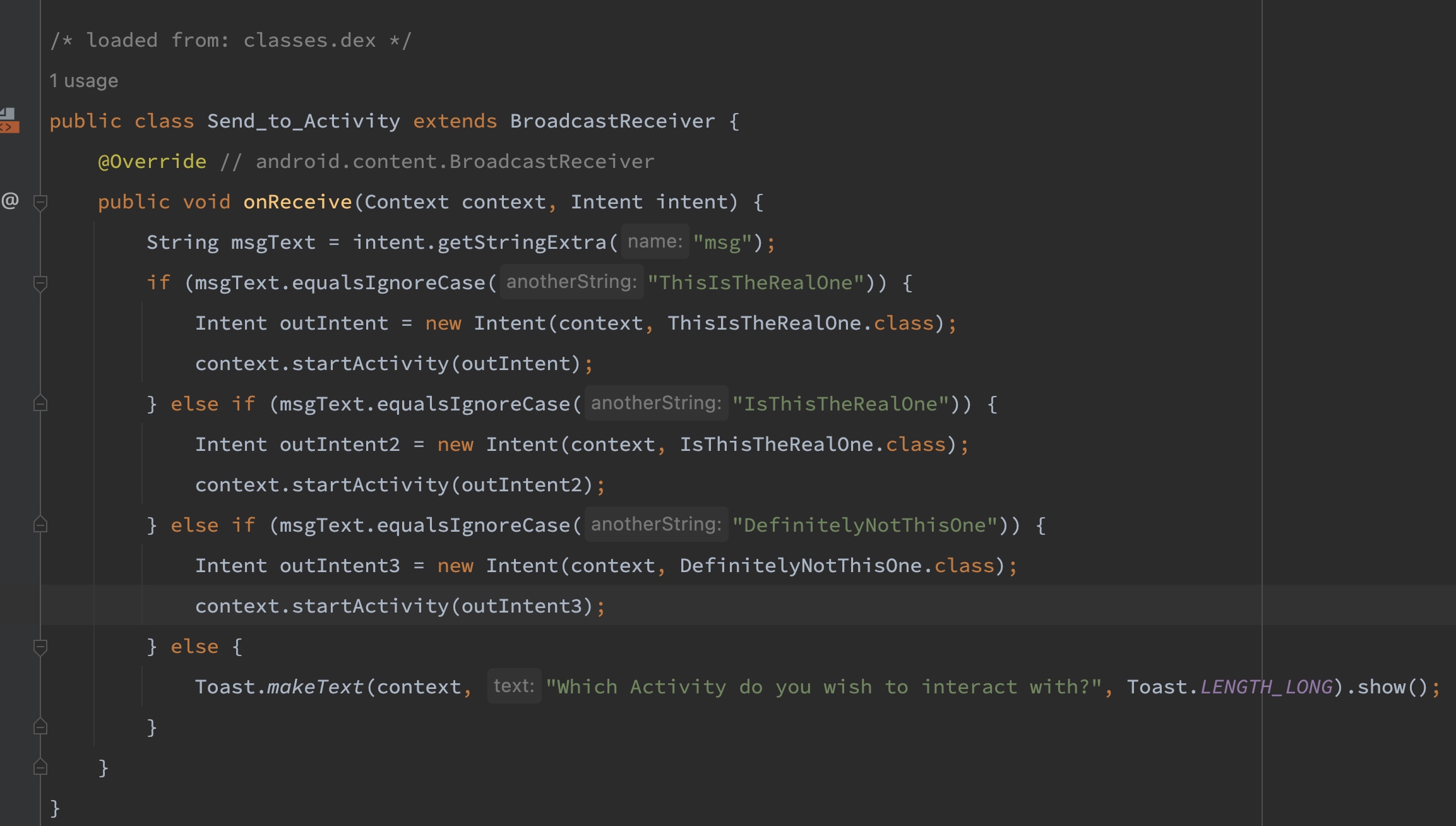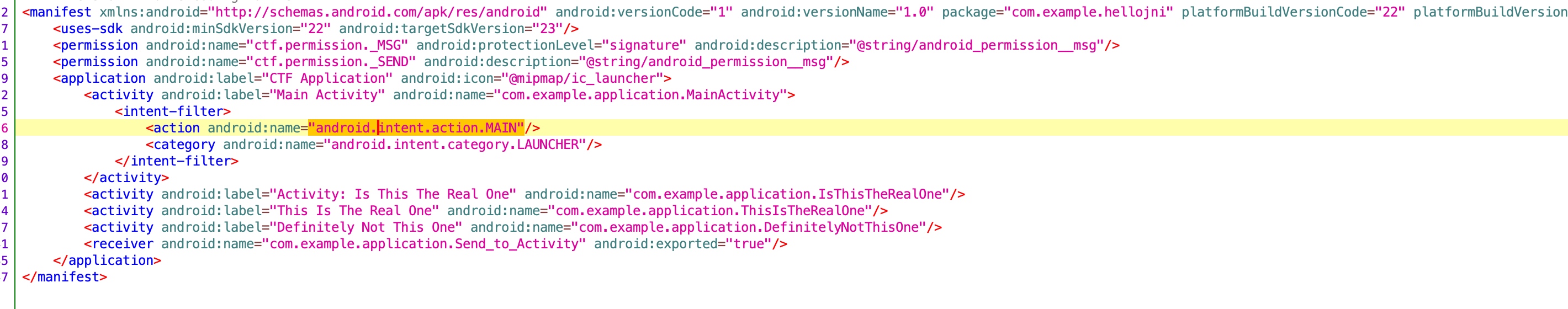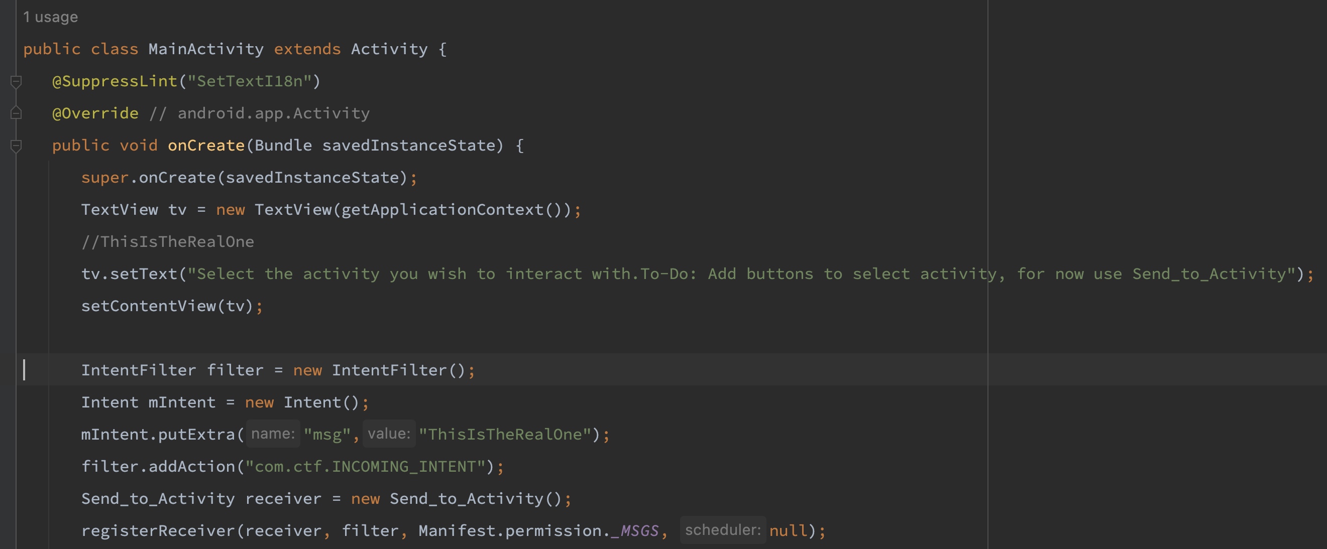 用jadx反编译了应用程序,看到如果我们可以选择应用程序活动并接收应用程序发送的广播消息,我们将得到解决方案。我没有为第一个挑战安装Android IDE,只有一个旧的Android SDK和apktool。