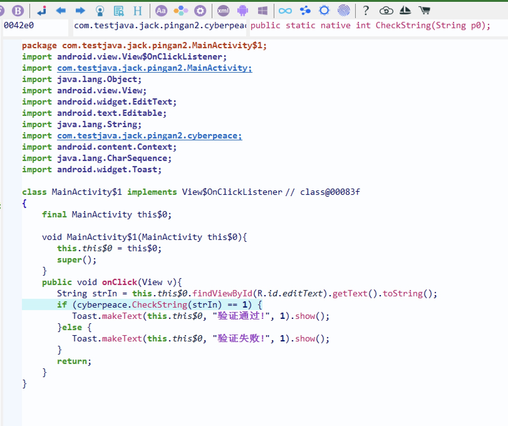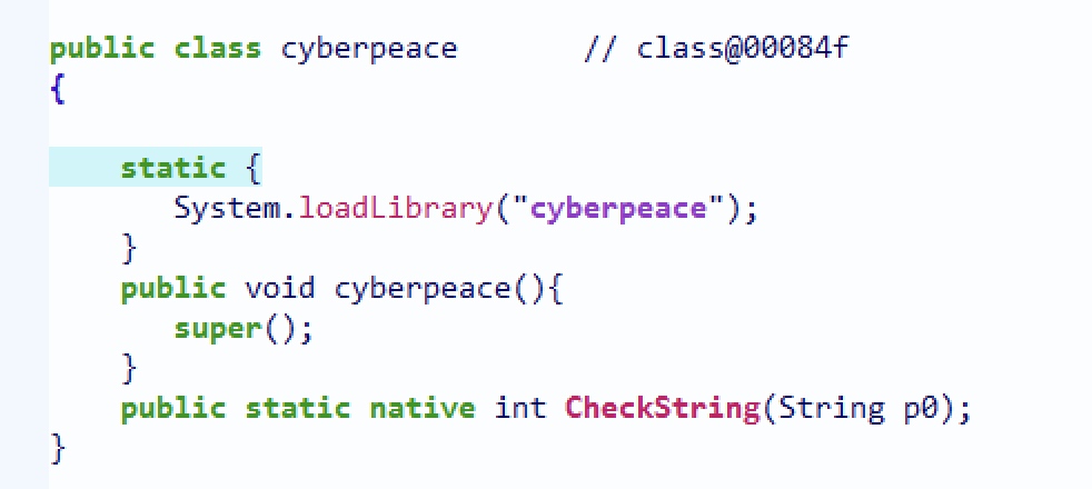 查壳,发现无壳,用jeb反编译后,找到关键字验证失败所在类,发现调用了so层的