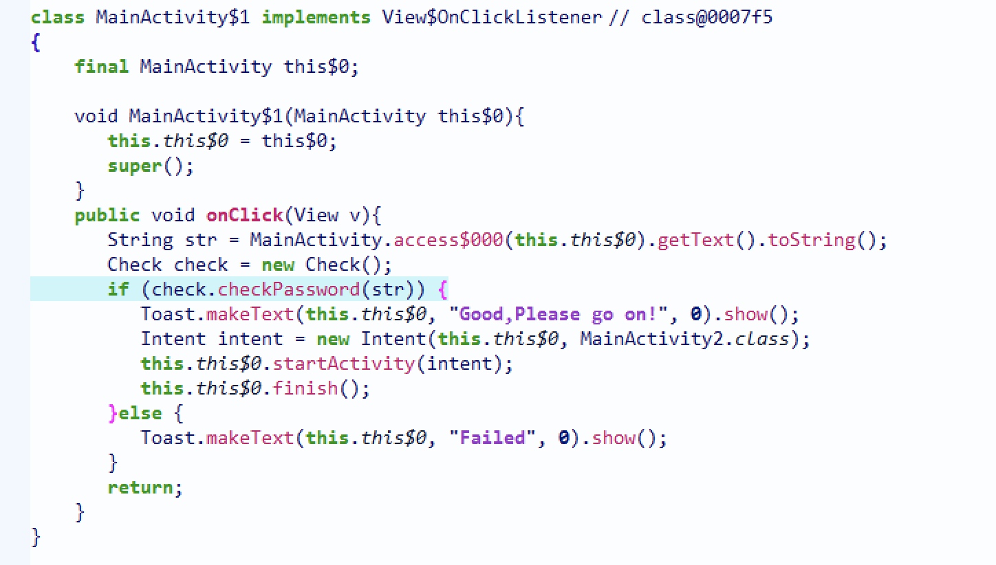 2、 查壳,发现无壳,使用androidKiller反编译后,找到关键函数验证所在的类,发现onClick后对