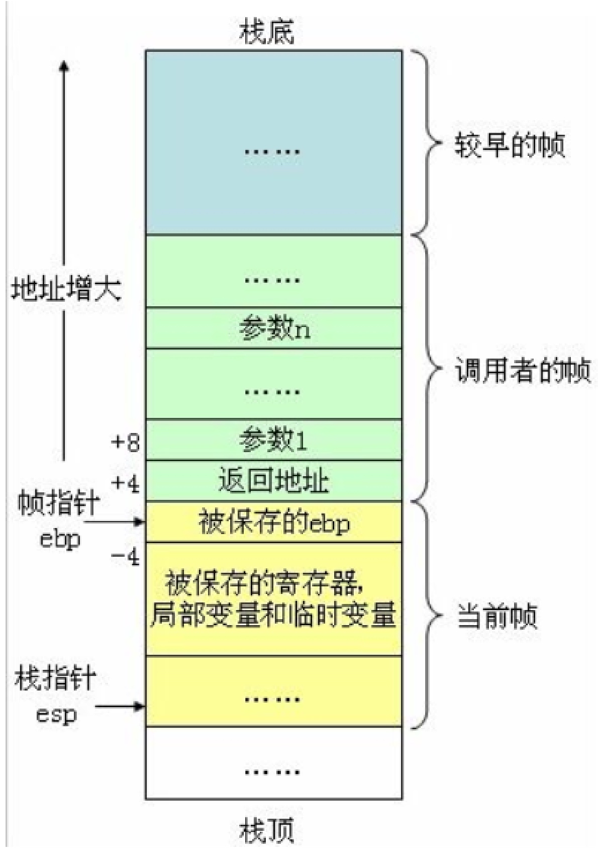 - 在一个函数中,ebp保存的是调用方函数的ebp,ebp+4保存的是当前函数的返回值,ebp-n 到 esp中保存的是所有的局部变量,ebp+8开始的位置保存的是当前函数的参数。