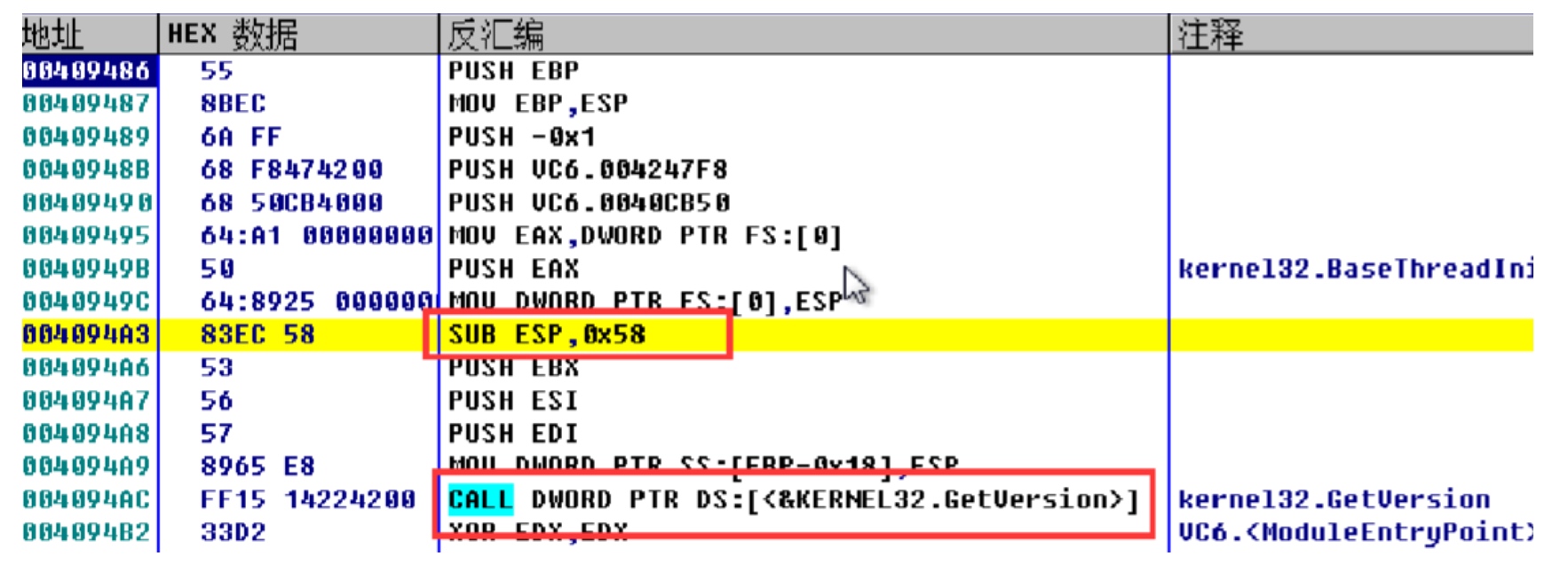 - sub esp, 0x58; call dword ptr [GetVersion];