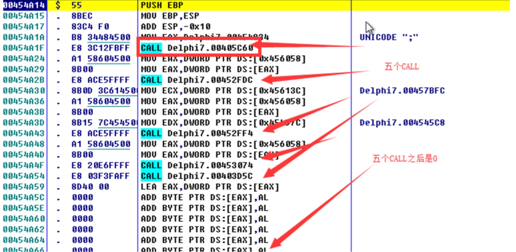 - 连续的5个call,紧跟着一串0,第一个call内调用了 GetModuleHandle