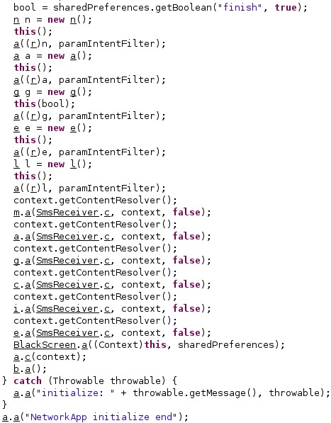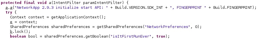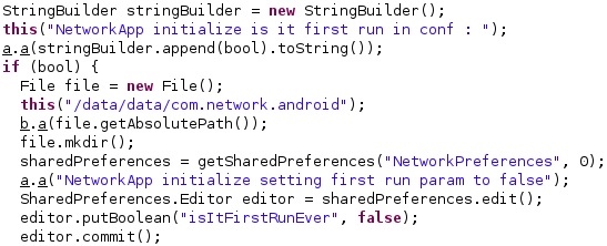 该过程验证设备上是否存在“/data/data/com.network.android”目录;否则,将创建它。目录的存在意味着这不是恶意软件的首次执行,使用putBoolean函数将“isItFirstRunEver”值设置为false: