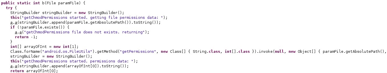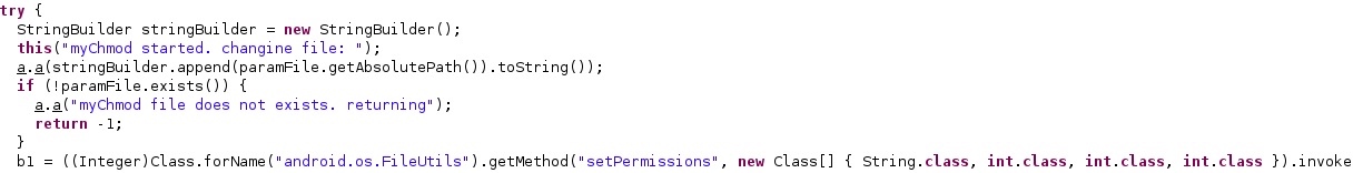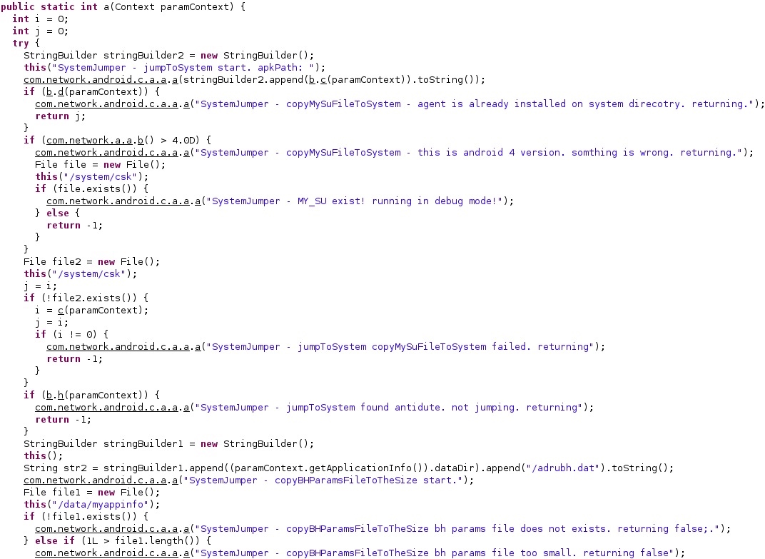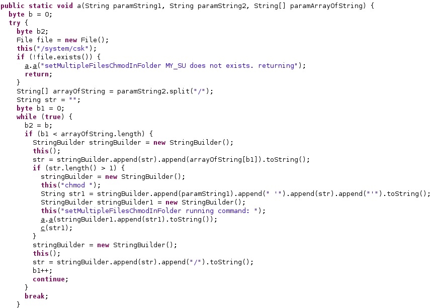 它检查手机上是否存在恶意APK文件,并将使用名为“/system/csk”的超级用户二进制文件来运行具有root权限的命令: