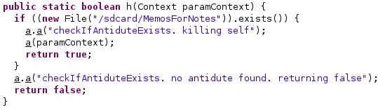 检查名为“/sdcard/MemosForNotes”的解毒剂文件,如果找到此文件,间谍软件将自行删除(见图)。