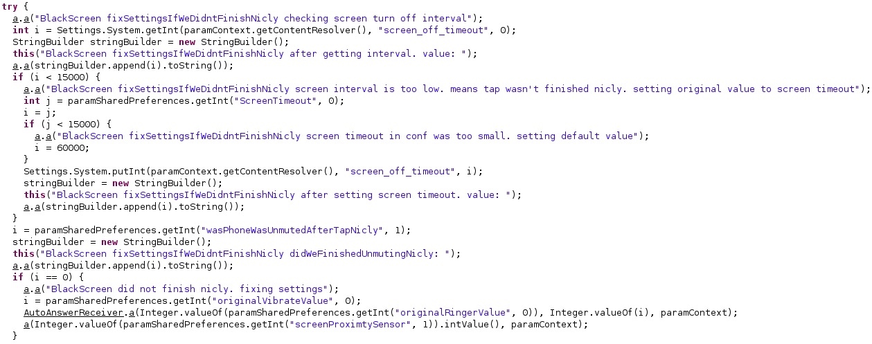 一个名为“screen_off_timeout”的值,表示设备进入睡眠状态或不活动后开始做梦前的毫秒数,由该过程提取,并与15秒进行比较。其他配置值,如“wasPhoneWasUnmutedAfterTapNicly”[原文如此]、“originalVibrateValue”和“originalRingerValue”也从配置中提取: