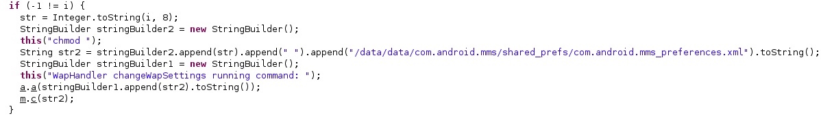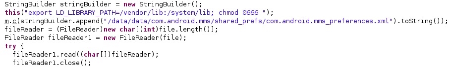它检索“/data/data/com.android.mms/shared_prefs/com.android.mms_preferences.xml”的文件权限,并使用chmod命令进行更改它们: