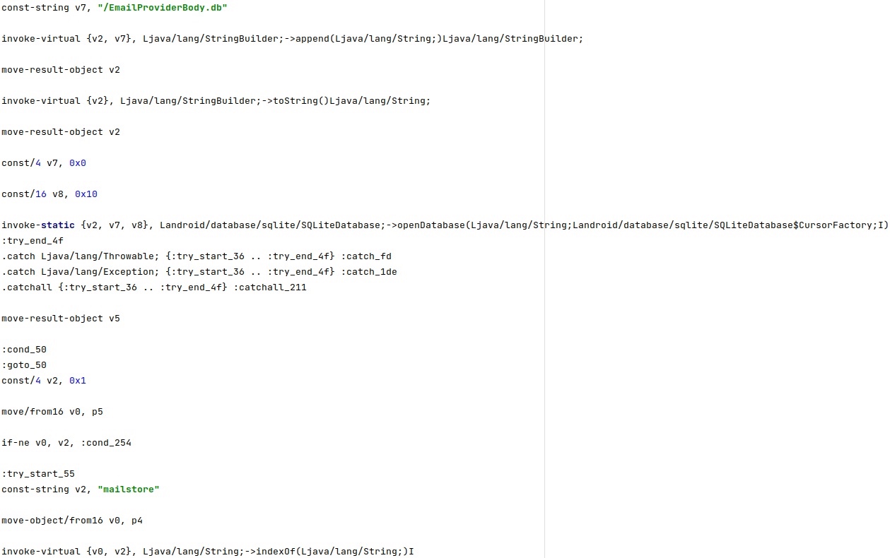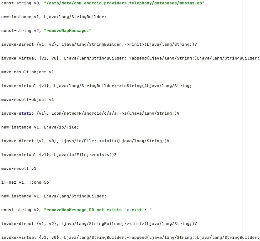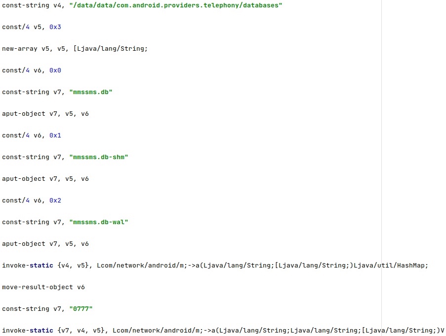恶意进程在“/data/data/com.android.providers.telephony/databases/mmssms.db”上检查是否存在SMS/MMS数据库: