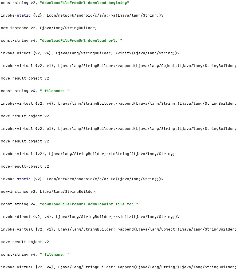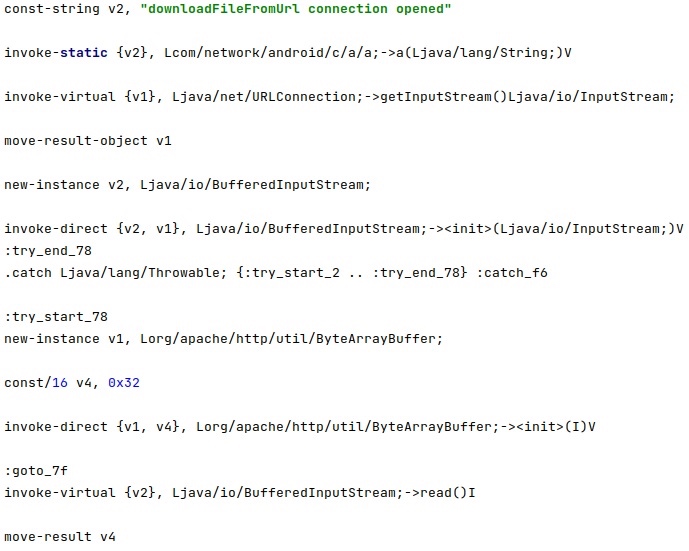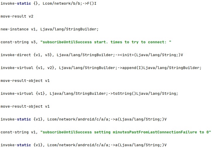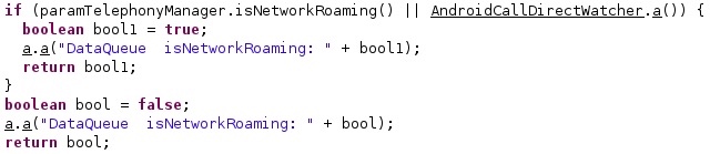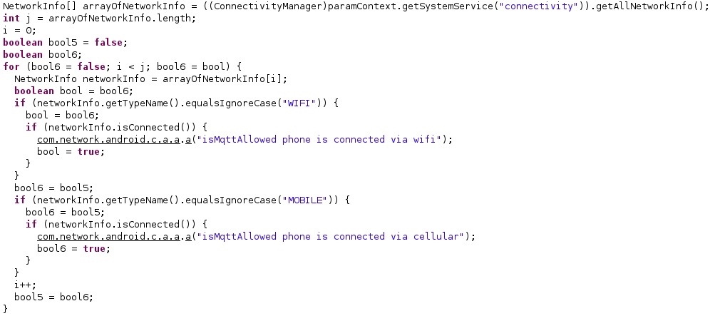 该恶意软件通过函数调用getAllNetworkInfo检索所有网络类型的连接状态信息,并将网络类型与“WIFI”和“MOBILE”进行比较: