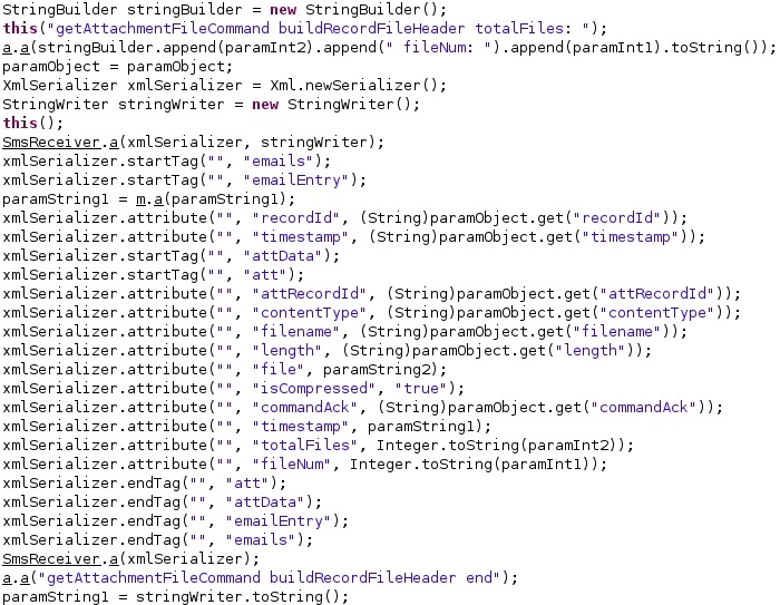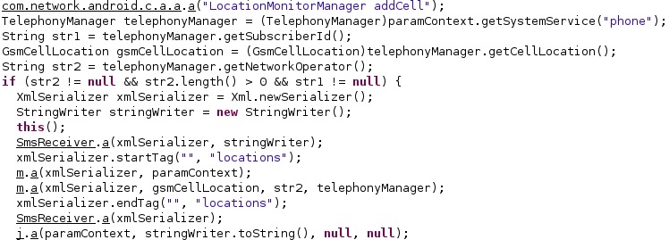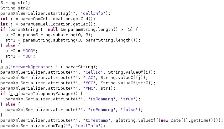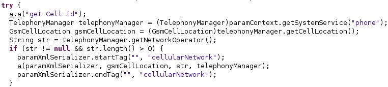 该过程通过使用getNetworkOperator调用getCellLocation和当前注册运营商的数字名称(MCC+MNC)来检索设备的当前位置。GSM单元ID和GSM位置区号也存储在XMLSerializer对象中: