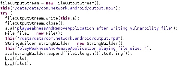 据我们所知,这是第一次提到Pegasus for Android利用了MediaPlayer中的漏洞。不幸的是,名为“/data/data/com.network.android/output.mp3”的负责开发的文件是空的,我们无法检索其内容: