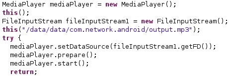 setDataSource方法用于设置MediaPlayer的数据源。该应用程序准备并开始播放,我们认为这将导致利用漏洞: