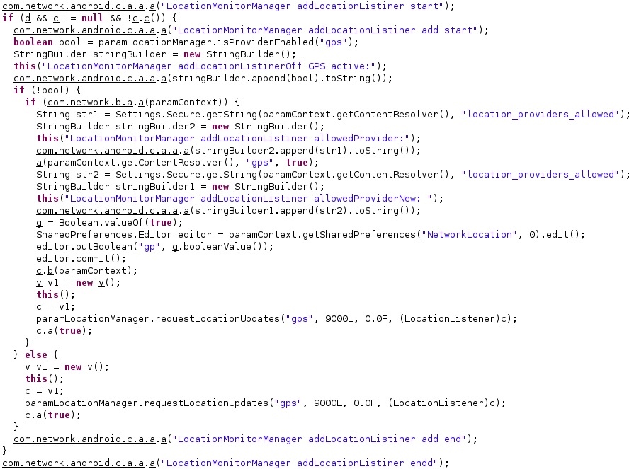 Pegasus间谍软件能够监控设备的位置。它通过调用isProviderEnabled函数来验证GPS提供程序是否处于活动状态,然后使用requestLocationUpdates函数获取位置信息: