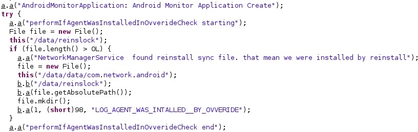 间谍软件验证设备上是否存在“/data/reinslock”文件,这表明应用程序已重新安装:
