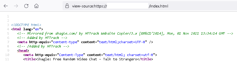如图2所示,虚假网站的HTML代码包括使用自动工具HTTrack于2021年11月1日从合法的shagle.com网站复制的证据。恶意域名是在同一天注册的,因此自该日期以来,模仿网站和假Shagle应用程序可能已经可供下载。