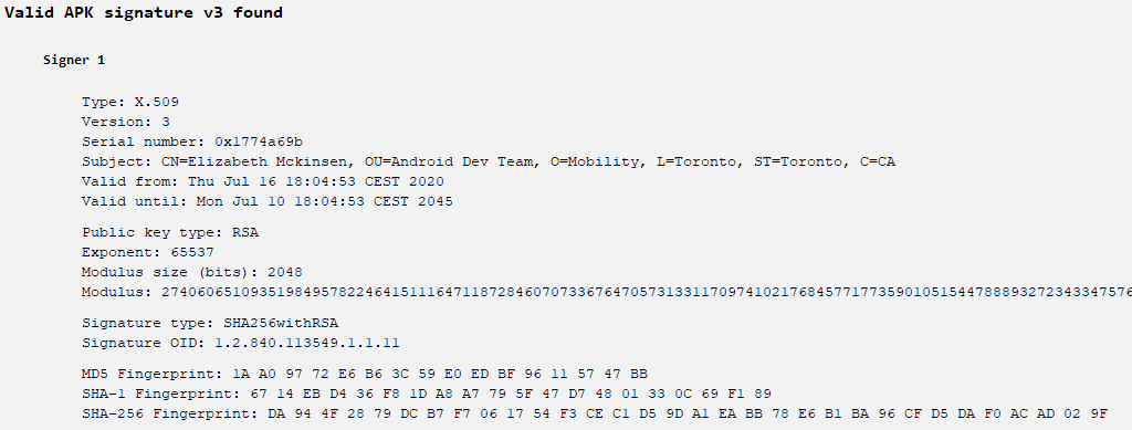 由模仿Shagle网站分发的APK使用与趋势科技在2021年发现的特洛伊木马化的叙利亚电子政务应用程序相同的代码签名证书(见图3)签名,该应用程序也归因于StrongPity。