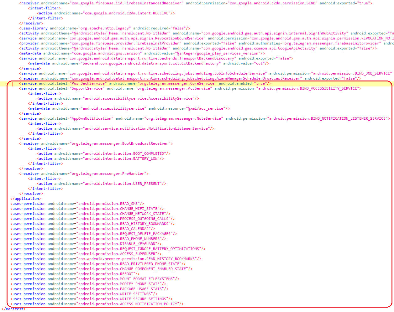 从Android清单中,我们可以看到恶意类被添加到org.telegram.messenger软件包中,以显示为原始应用程序的一部分。