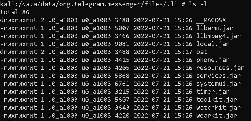 初始恶意功能由定义操作后执行的三个广播接收器之一触发——BOOT_COMPLETED、BATTERY_LOW或USER_PRESENT。第一次启动后,它会动态注册其他广播接收器,以监控SCREEN_ON、SCREEN_OFF和CONNECTIVITY_CHANGE事件。然后,假的Shagle应用程序使用IPC(进程间通信)在其组件之间进行通信,以触发各种操作。它使用HTTPS联系C&C服务器,发送有关受损设备的基本信息,并接收包含11个二进制模块的AES加密文件,这些模块将由父应用程序动态执行;见图10。如图11所示,这些模块存储在应用程序的内部存储中,/data/user/0/org.telegram.messenger/files/.li/。